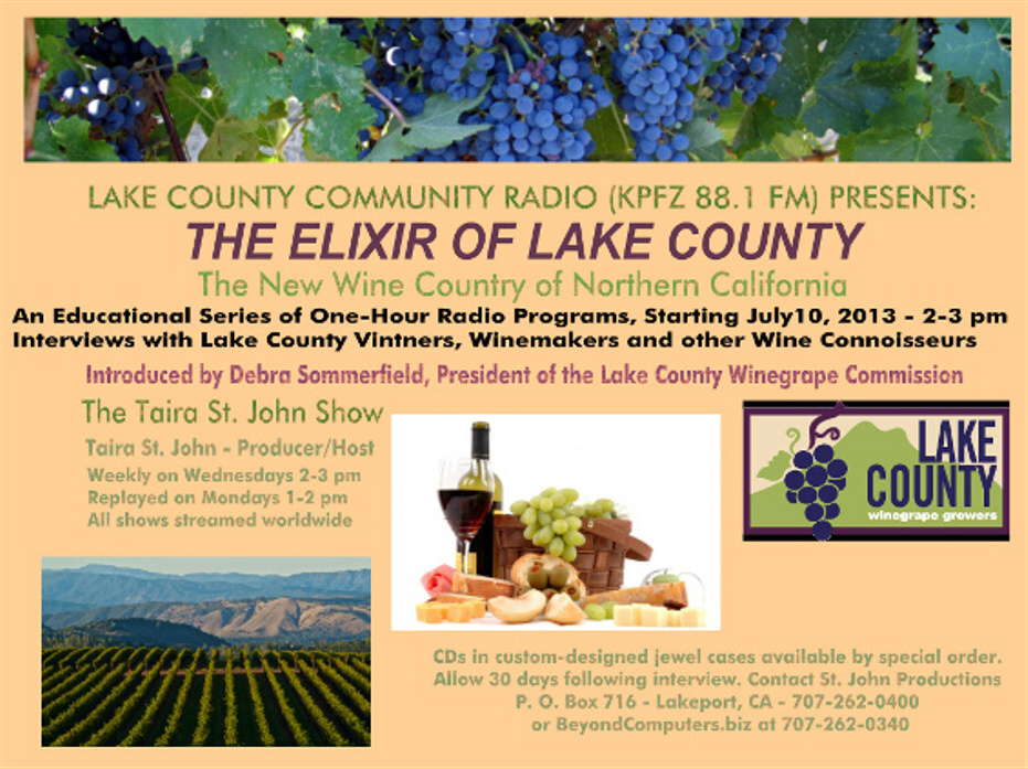 The "Elixir of Lake County: the New Wine Country of Northern California" is a new interview series with winegrowers, winemakers and other vintners. The series was introduced by on July 10, 2013 - 2-3 pm (Pacific) by Debra Sommerfield, President of the Lake County Winegrape Commission and former Deputy Chief Administrative Officer for Economic Development.
